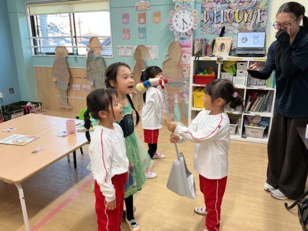 クラスにある手作りマイクを持ってきて、みんなに向けてあげている