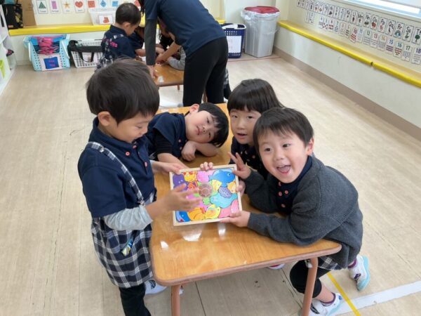 夏頃には、「this is mine!」と喧嘩になることもあったパズルですが、、、今では協力することができるようになり、数人で1つのパズルを完成させてくれます!🧩