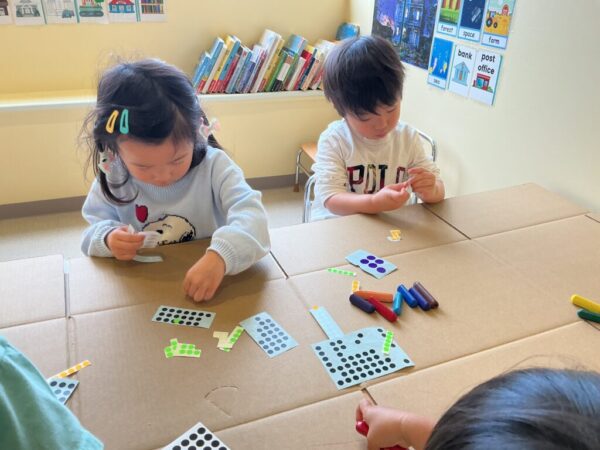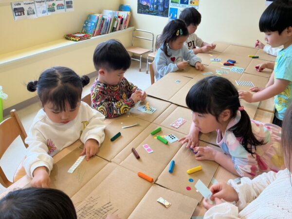 今日は大きな段ボールにクレヨンやステッカーを貼っていきましたよ!