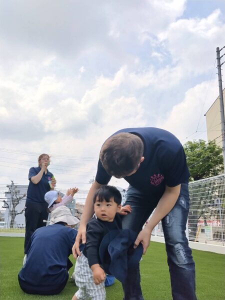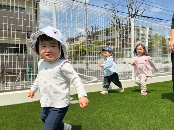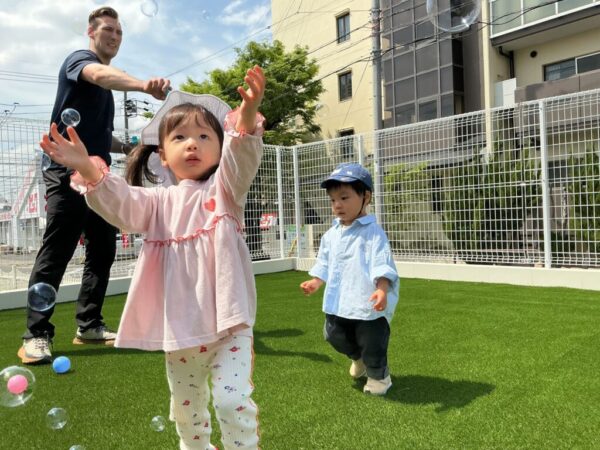 お天気のいい日は、人工芝の園庭でのびのびとシャボン玉🫧を追いかけて遊びました!