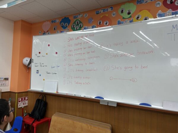 クラスの始まりは文法からです。今回は、she’s doing ~(現在進行形)を学びましたよ。