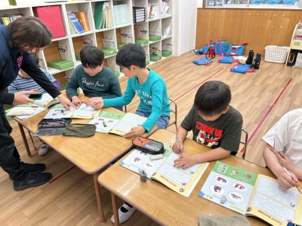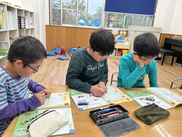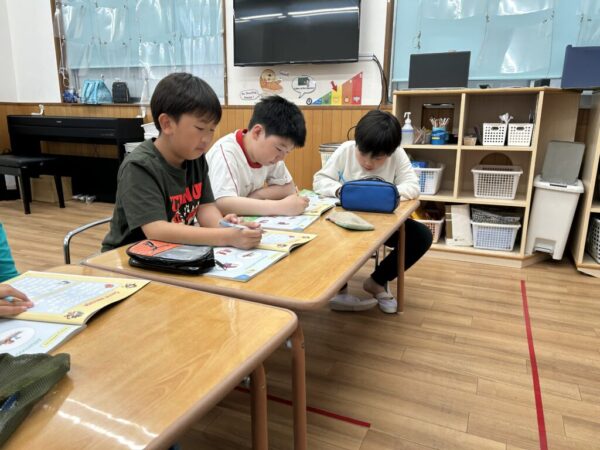 “He’s doing~”や“It’s doing~”など口に出して黒板の文章と照らし合わせている
