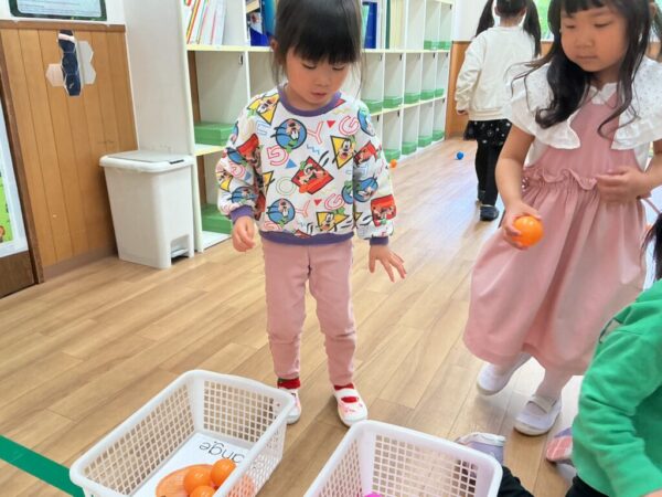 みんなでcolorを覚えた後は、床に散らばったカラーボールをカラー別に