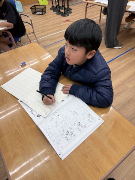 ゲームの後はノートを使って、「They are 〇〇.(それらは〇〇です)」と書く練習をしました。「What are they?(それらは何ですか?)」と聞くと、「They are horses.(それらは馬たちです)」と答えることが出来ました。