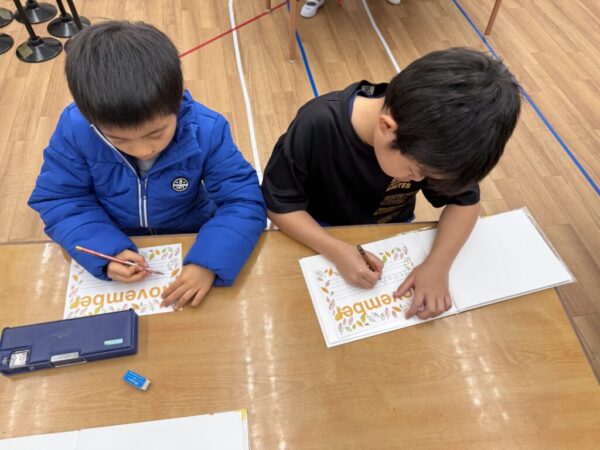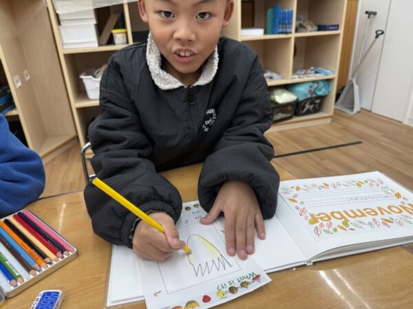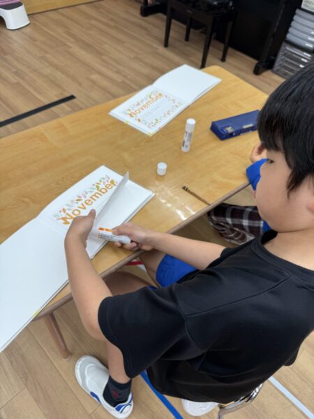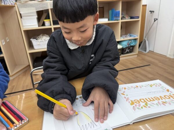 そして、11月のSpecial activityでは、各自の好きなフルーツを描き、「It’s a 〇〇.(それは〇〇です)」と書きました。