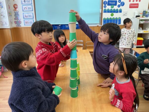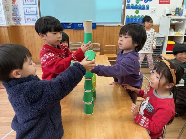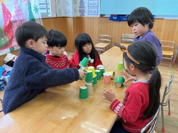 2チーム対抗でカップでChristmas treeを作りましたよ!!