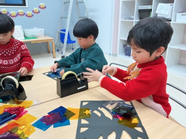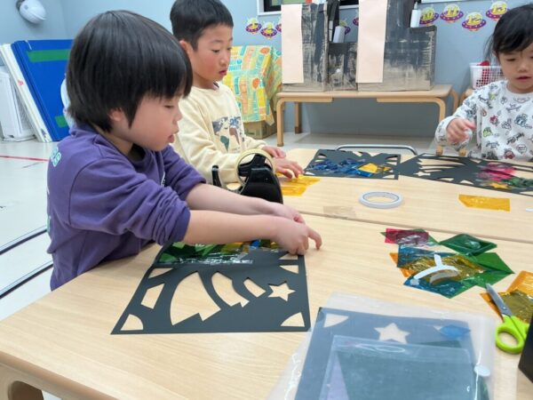 みなさんカラフルな透明フィルターを使ってステンドグラスを作ってくれましたよ!