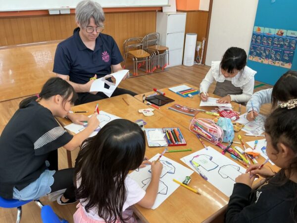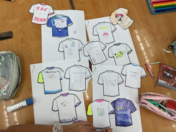 “Today, we’ll make T-shirts! Write some English words. Make a nice design!”(今日はTシャツを作ります。英語をいくつか書いてね。素敵なデザインにしよう。)