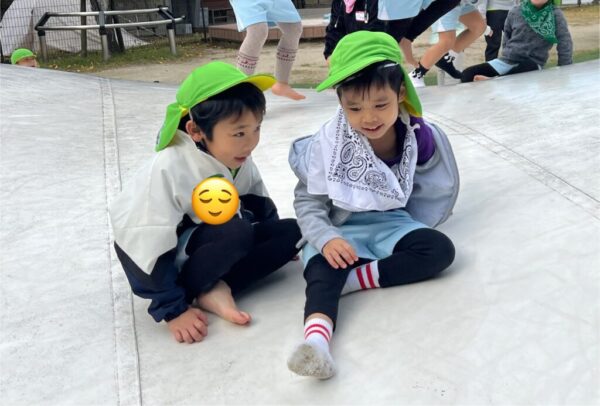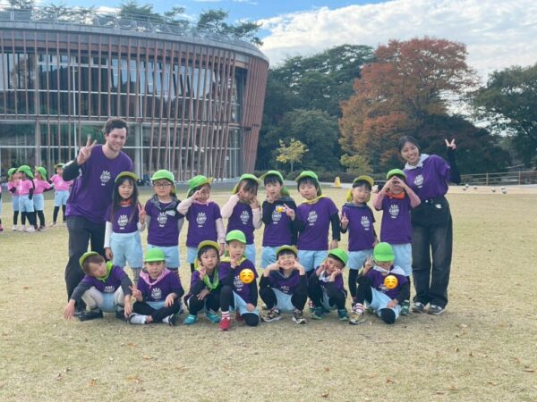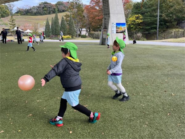 広いグラウンドでは「Let’s play soccer together!(一緒にサッカーしよう!)」と別校舎のお友達を誘って遊んだりと、