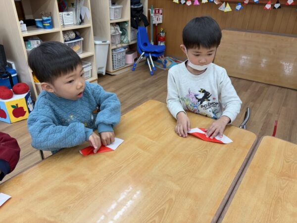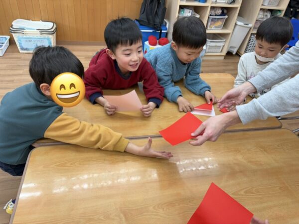 (折り紙く~ださい!)と折紙をもらい、