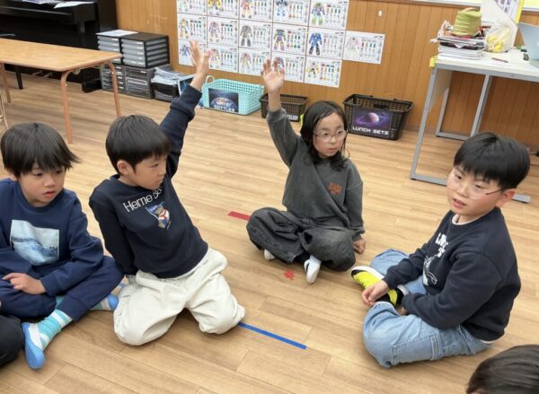 「Is it a marker?」「Is it a pencil?」とお互いに質問をしあったり、ヒントを出したりと会話を楽しみながらゲームに取り組むことができました。