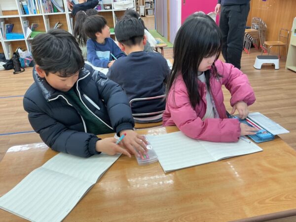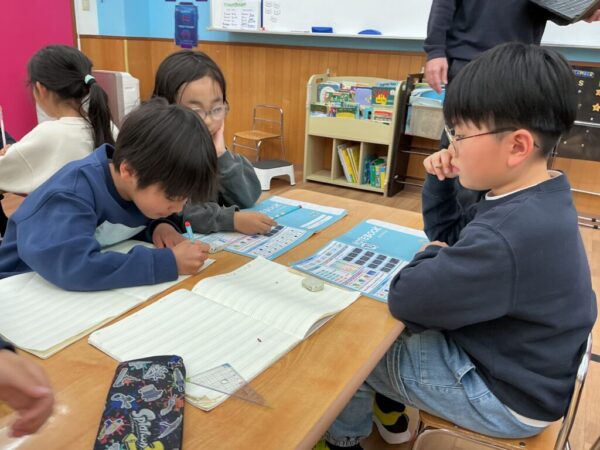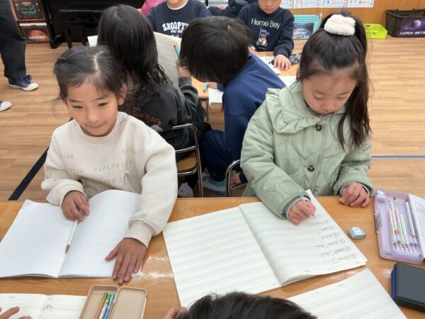 とても真剣な様子で取り組み、聞き取った英単語を「Hair?」「Pair?」と声に出しながらノートに書いていたお子さま達です。