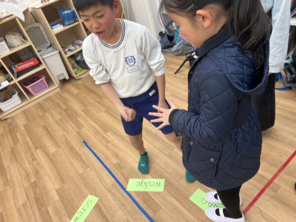 「Screw」や「Lever」などの単語カードを床に一直線に並べ、チーム対抗のゲーム形式で挑戦します。