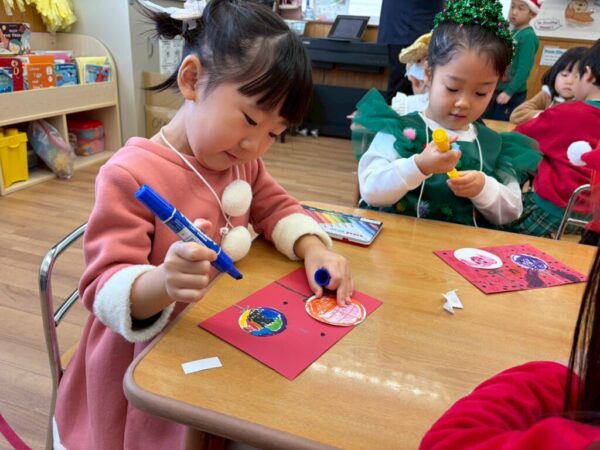 お子さま達は丸いオーナメントに色鉛筆やペンを使ってお子さまオリジナルのオーナメントを作りました⭐︎