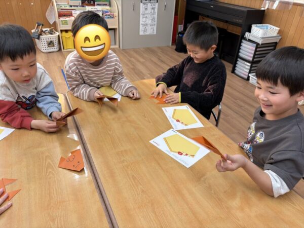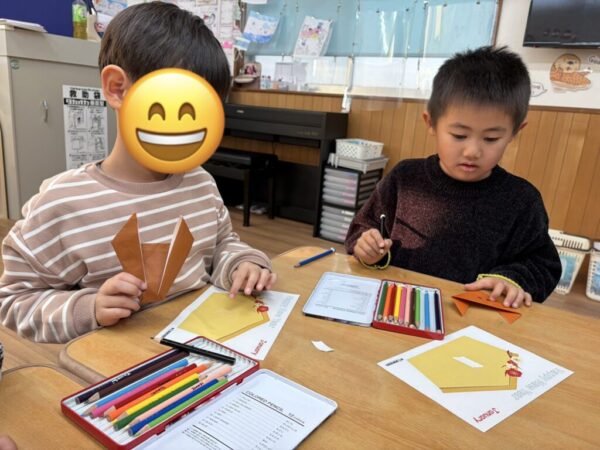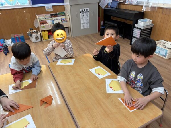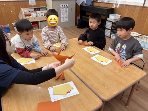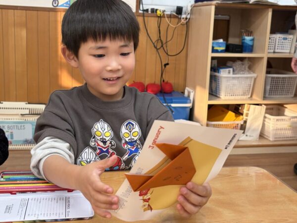 折紙の見本を見せると「Horse!(ウマだ!)」と大きな声で教えてくれるお子様達。