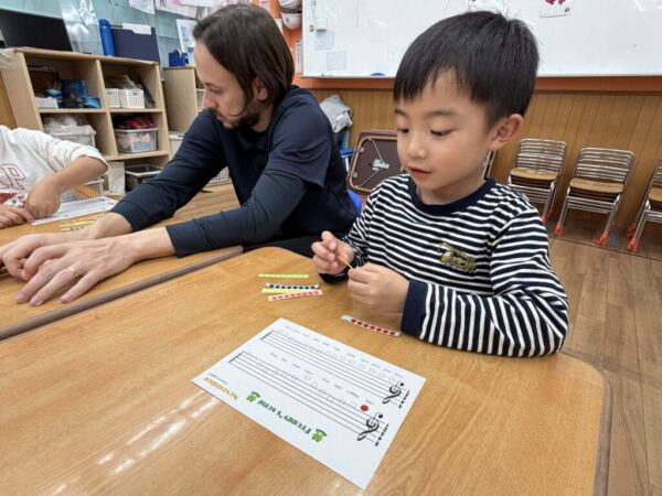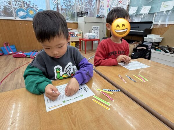 カエルの合唱を歌いながら音符にシールを貼りましたよ♪