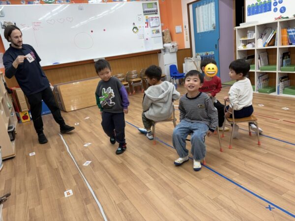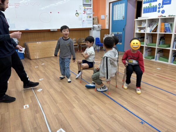 音楽に合わせてPhonics学習を交えたイスとりゲームを楽しみました。