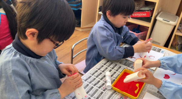 スタンプができたら、スタンプに絵の具をつけ、たくさんのハートを押していきました!