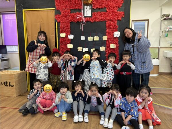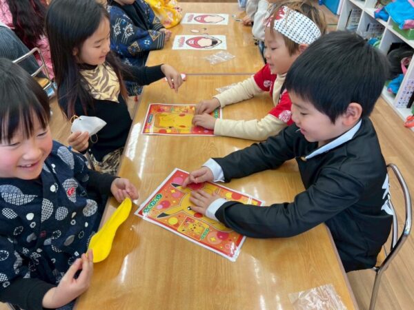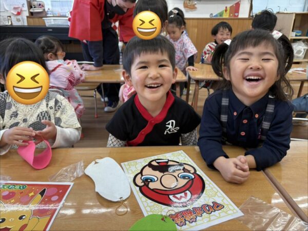 近くのお友達と完成した福笑いの可笑しさを共有し合って楽しんでいる姿が見られましたよ♪