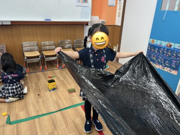 教室を真っ暗にするための黒いビニールを広げるところからお手伝いしてもらいました♪