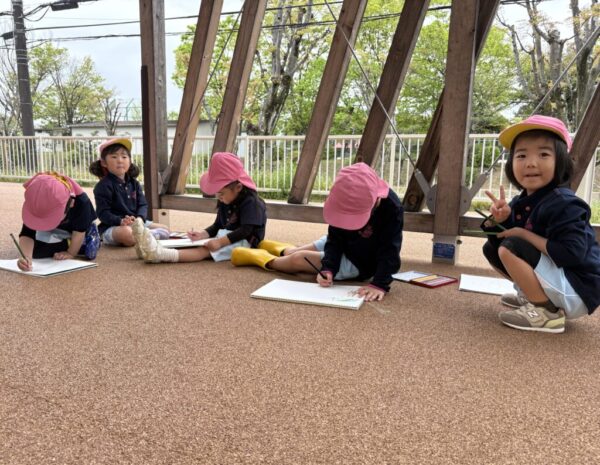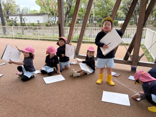 今回のArtクラスでは、「春を見つけてみよう」をテーマにみんなで園庭に出て