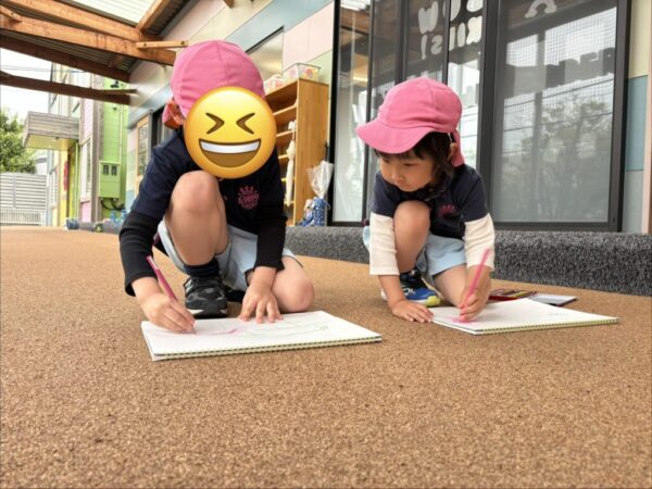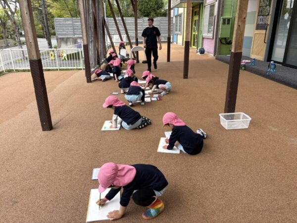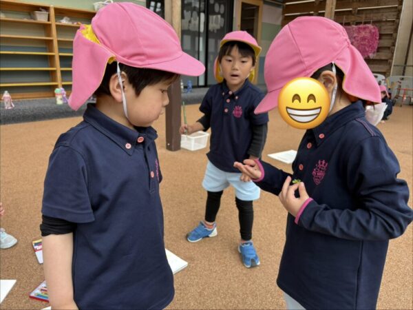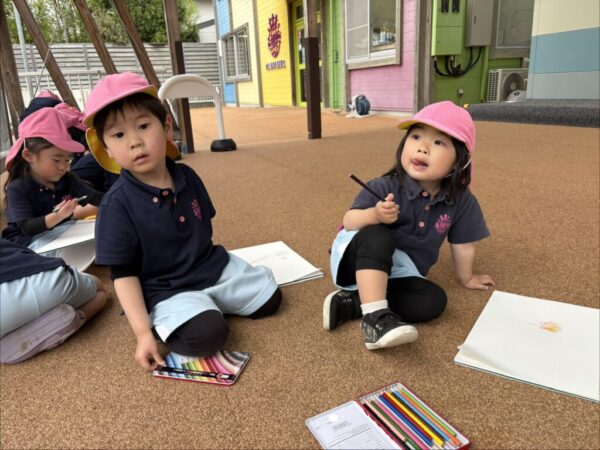 お子さま達は園庭から見えるお花や葉を見つけて、「I found some cute flowers!(かわいいお花みつけた!)」と教えてくれたお子さまもいました。