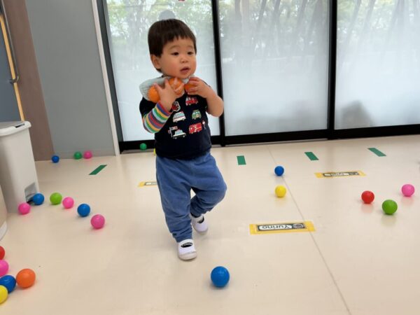 カラーボールを両手いっぱいに持って運んで。