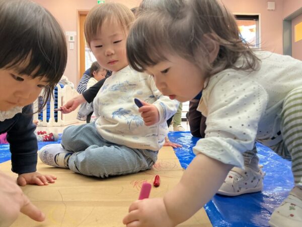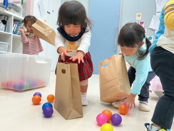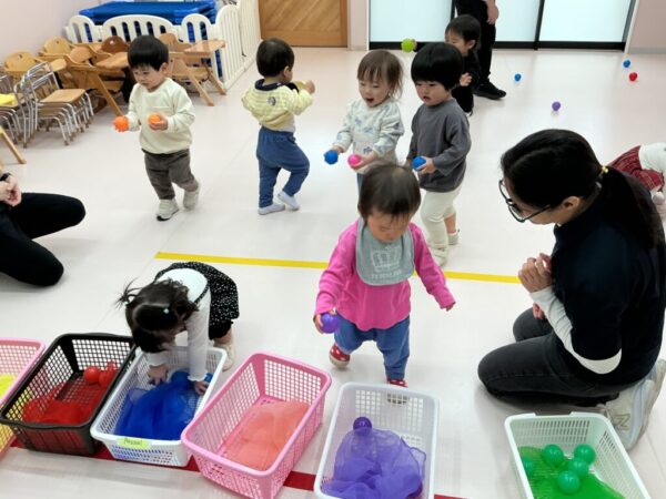 床に散らばったカラフルなボールを色別に仕分けをするアクティビティーを行いました!