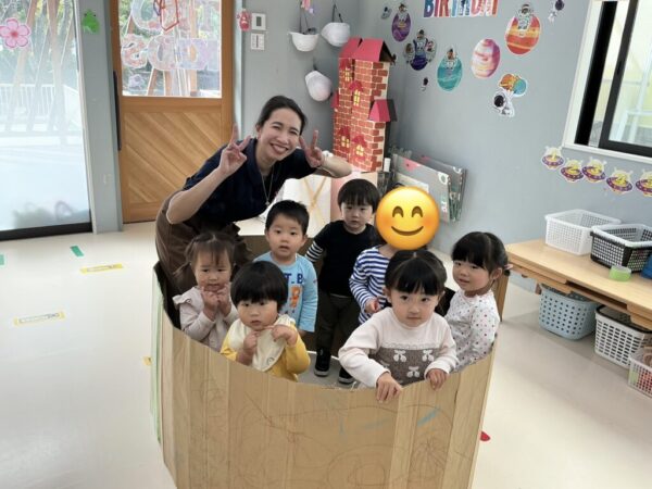 大きな段ボールに絵を描いてオリジナルのバスもみんなで作成しましたよ♪