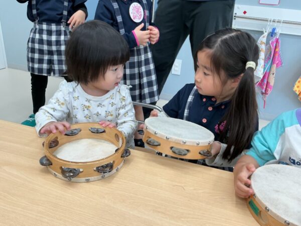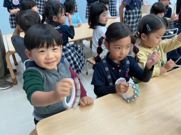 お隣で見本を見せてもらいながらタンバリンやスズを使いました!