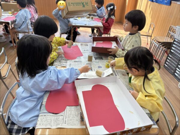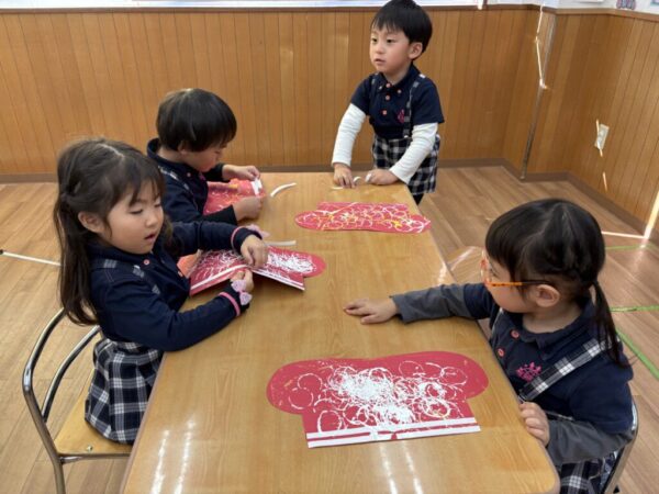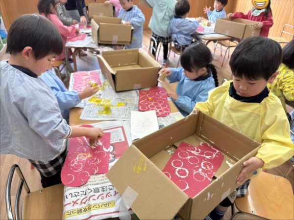 スタンプではトイレットペーパーの芯と白色の絵の具を使ってスタンプをしました。