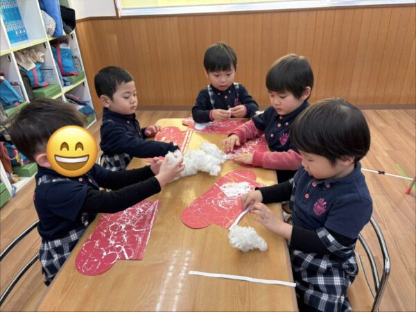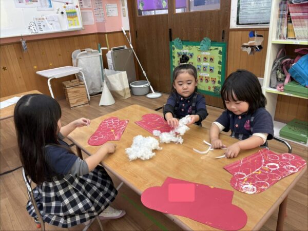 お子さま達は綿を使ってサンタブーツのふわふわを作りましたよ!