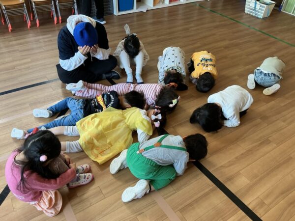 蜘蛛の巣の上を渡る蜘蛛役のお子さまが蜘蛛から逃げる昆虫役のお子さまをタッチするというゲームをしました。