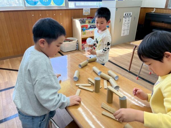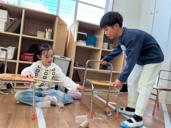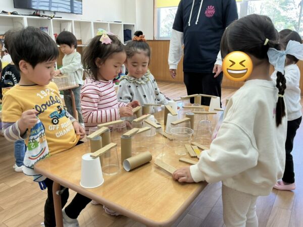 お子さま達は身近にあるトイレットペーパーの芯、紙コップ、カプロブロックを使ってムシさん達が通る橋を作っていきます。