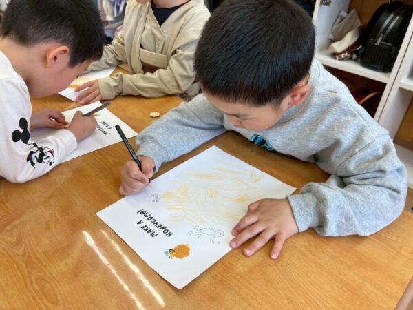 お子さま達は六角形のパーツをたくさん鉛筆でなぞり、蜂の巣のような絵を描くことができました⭐︎