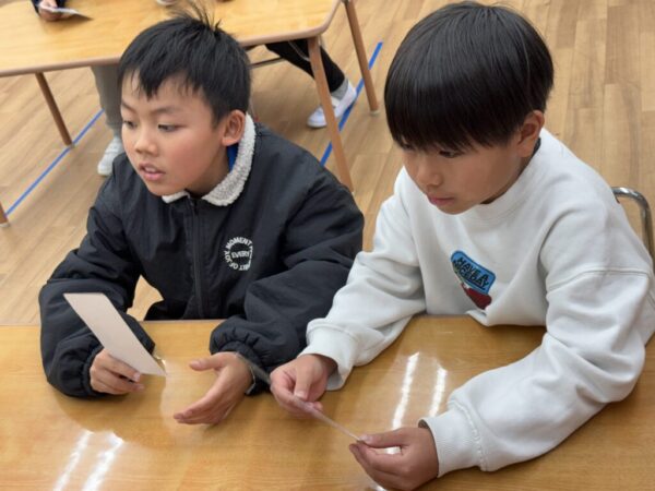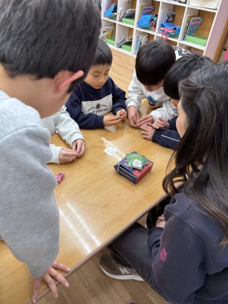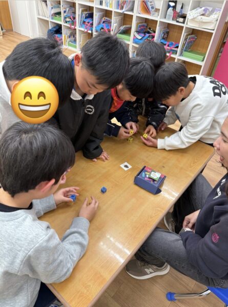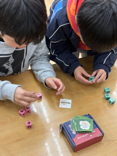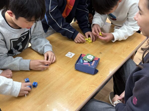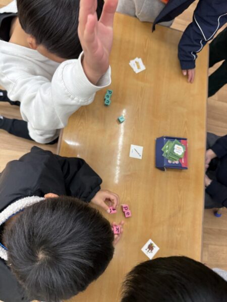 まずは二つのグループに分かれ、協力してお題の単語を作るゲームを行いました。どちらのグループがお題の単語を完成させるのが早いのか競います。