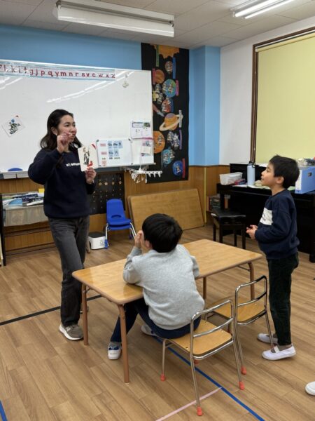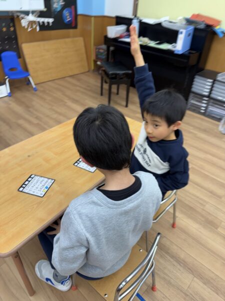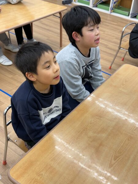 講師が「What does he do?(彼は何をしていますか?)」と聞くと「Conductor(指揮者)」手を上げて答えてくれる様子が見られました。