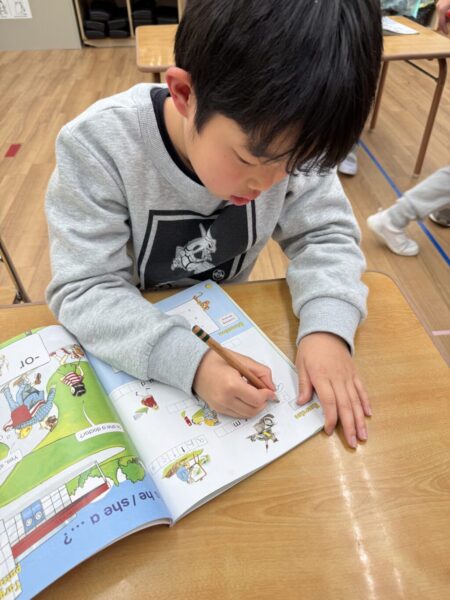 続いては実際に綴りを書く練習をしました。単語の発音を聞き、「Fisherman(漁師)…」と繰り返し呟き、試行錯誤をしながら単語を書きます。