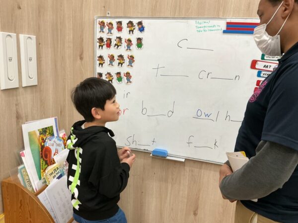 フォニックスも難易度が上がりました。Kenzel講師の発音と今までの練習の記憶を頼りに、穴埋めをしていきます。