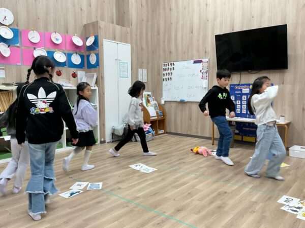 クラスを円になって歩いてまわり、Kenzel講師に指定された子どもが単語を一つ言い、その周りに素早く集まります。