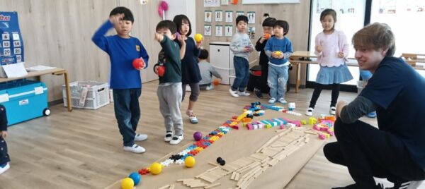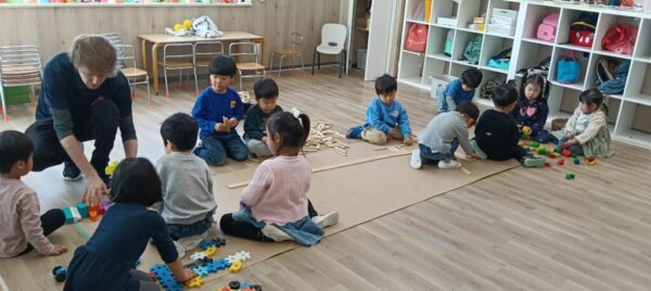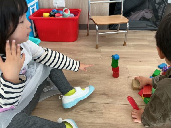 プレスクールでは、ブロックを使ってアリのお家を真似してみたり、