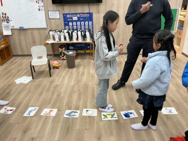 学習済みの単語を一通り復習し床に並べ、目を隠している間に一枚カードを取り何が無くなったかな?というゲームをしました。