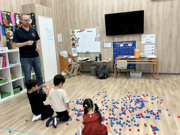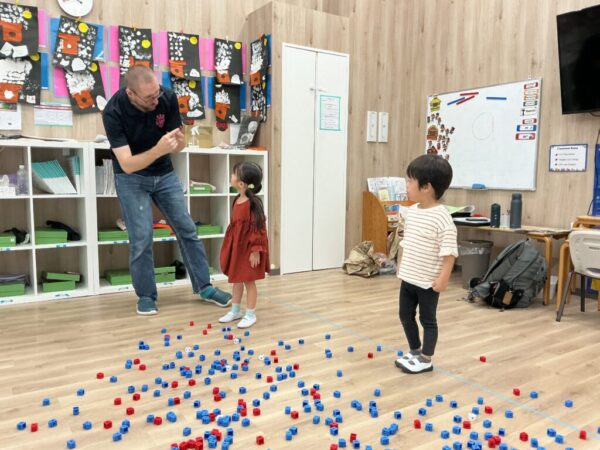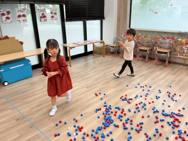 フォニックス練習では、椅子取りゲームのように音楽が流れている間歩いたり、スキップをし、音楽が止まったらホワイドボードに書かれたアルファベットと同じブロックを見つけて音を言ってみるアクティビティをしました。