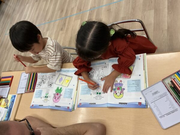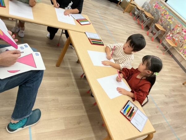 シールや色鉛筆を使って、pink heart(ピンクのハート)、green square(みどりの四角)などと口にして練習しています。