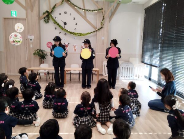 警察官の方や交通指導員さんのお話をしっかり聞き、安全な横断歩道の渡り方などを教えてもらいましたよ。