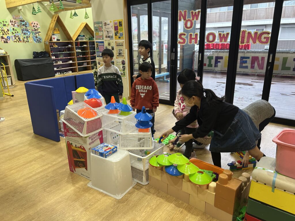 お友達同士でアイデアを出し合って、バリケードの完成です🏙️