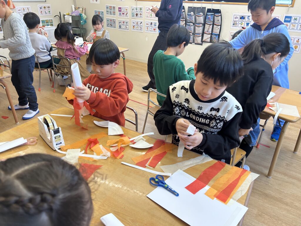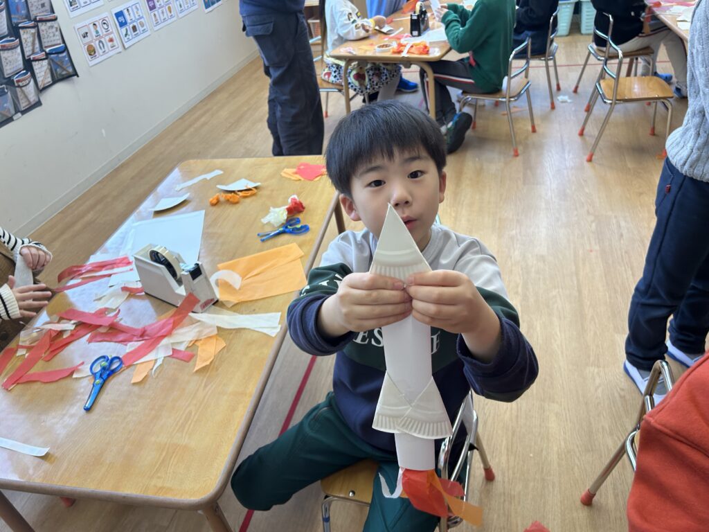 花紙ペーパーをちぎって、テープで貼って『Rocket(ロケット)』を完成させてくれました🚀