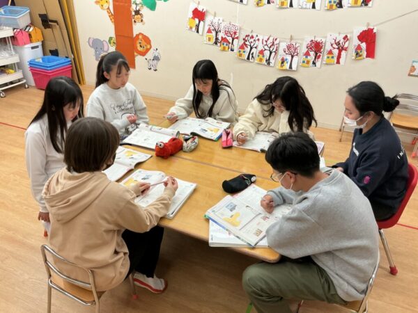 最初は教科書の読み合わせを全員で行います!その後は、ペアになって覚えた単語を使いながら会話を楽しんでいます!今回は「Are you free tomorrow?」という文章を練習しました。