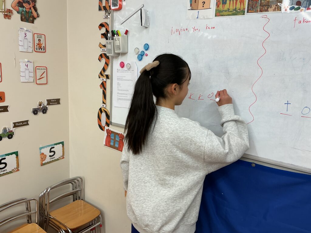 ゲームアクティビティではフラフープを使い、手を繋いだままフープをゴールまで運びます。ゴールに置いてあるペンでホワイトボードに指定された単語を書いていきます。チーム対決で、早く書けたチームの勝ちです!