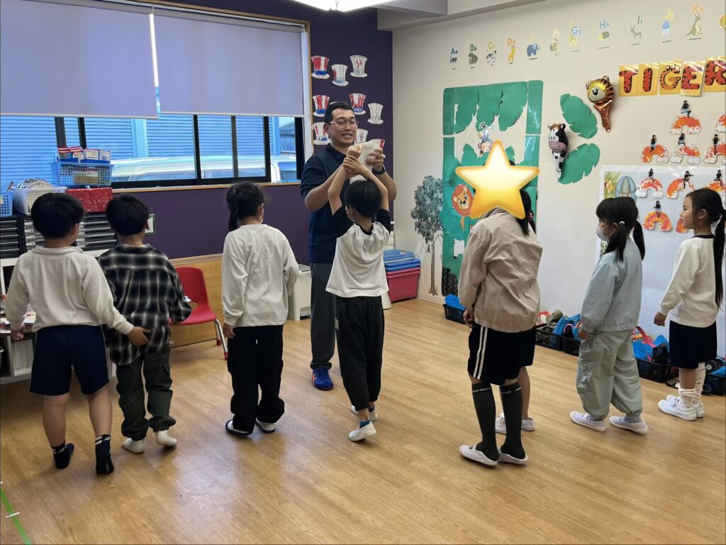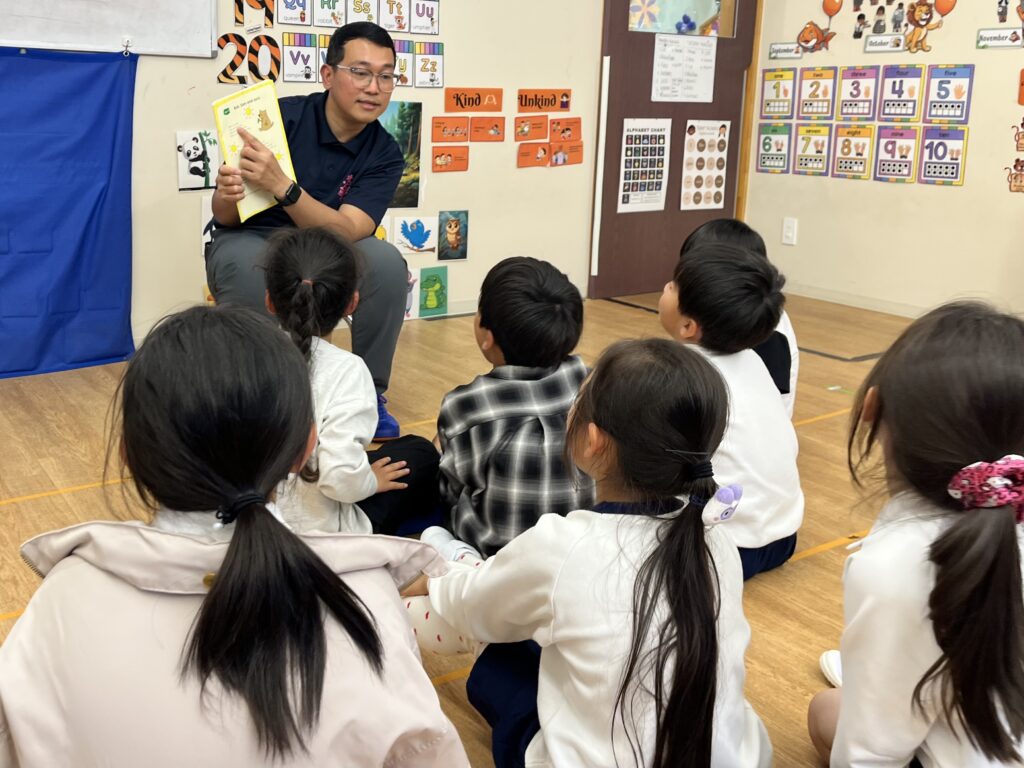 最後はお話の時間です。先生が読んだ後に一緒に言う練習をしています。